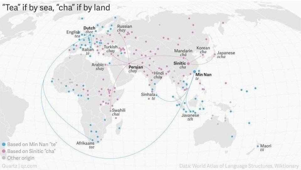 Получается, что европейцы "экспортировали" чай вместе с названием, и оно прижилось в их колониях и самой Европе. А по суше чай пришёл с привычным нам названием, и оно закрепилось на Ближнем Востоке, в России, Восточной Европе и Восточной Африке. А вот Индия и Китай оказались разделены.