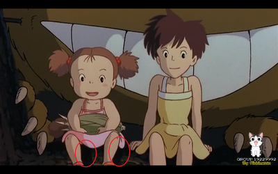 Ну, во-первых, обеих сестер зовут Мей. Ну то есть маленькую зовут May - пятый месяц по-английски, а старшую - Сацуки, пятый месяц по-японски. А самое страшное знаете что? Последние 10 минут фильма девочки не отбрасывают тень. Понимаете, в студии Миядзаки очень аккуратные люди, они рисуют тень даже от одного листочка.. они не могли забыть нарисовать тени двух главных персонажей.