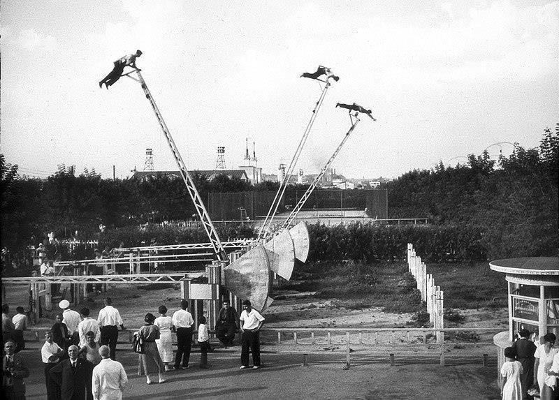 Аттракцион «Летающие люди». Парк Горького, 1937 год. Сеанс состоял из 6 полетов по дуге в 180 градусов.