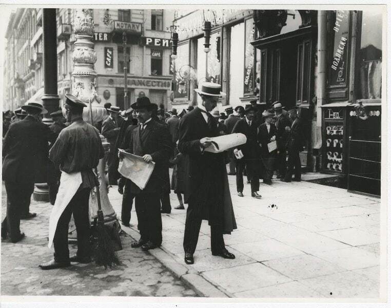 Объявление войны. Публика перед редакцией «Вечернее Время», Санкт-Петербург, 1914 год.