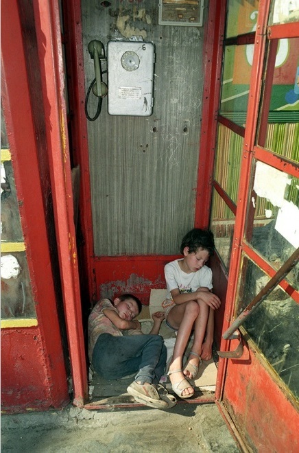 Беспризорники спят в телефонной будке, 1990-е годы.