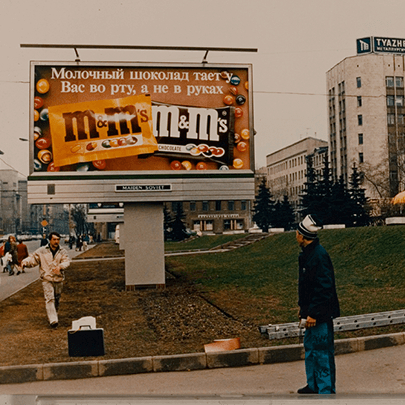 Парни на фоне рекламного плаката с ромом. Россия, 1997 год.