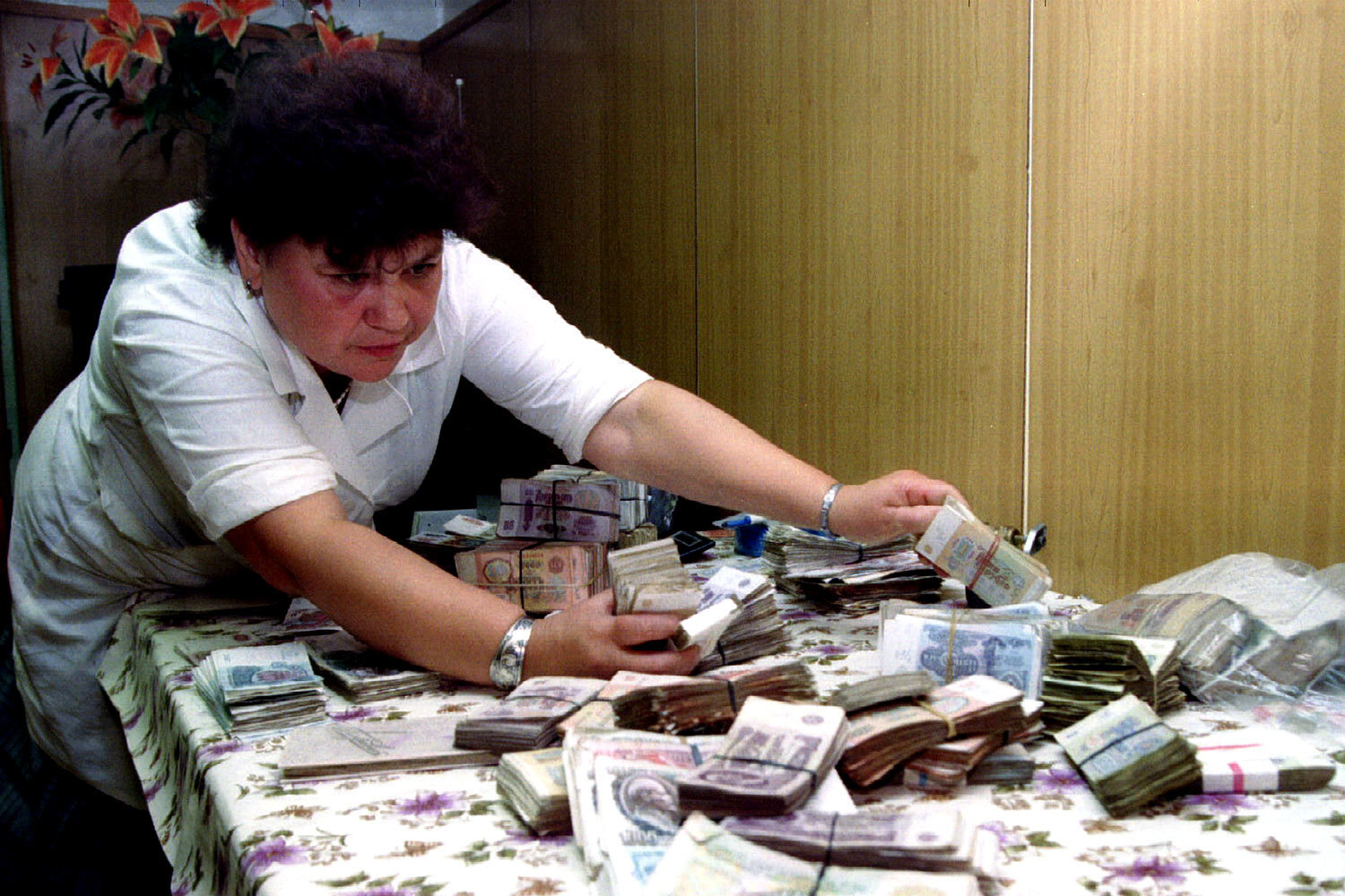 Работник государственного магазина пересчитывает рублевые банкноты, Москва, 1993 год.