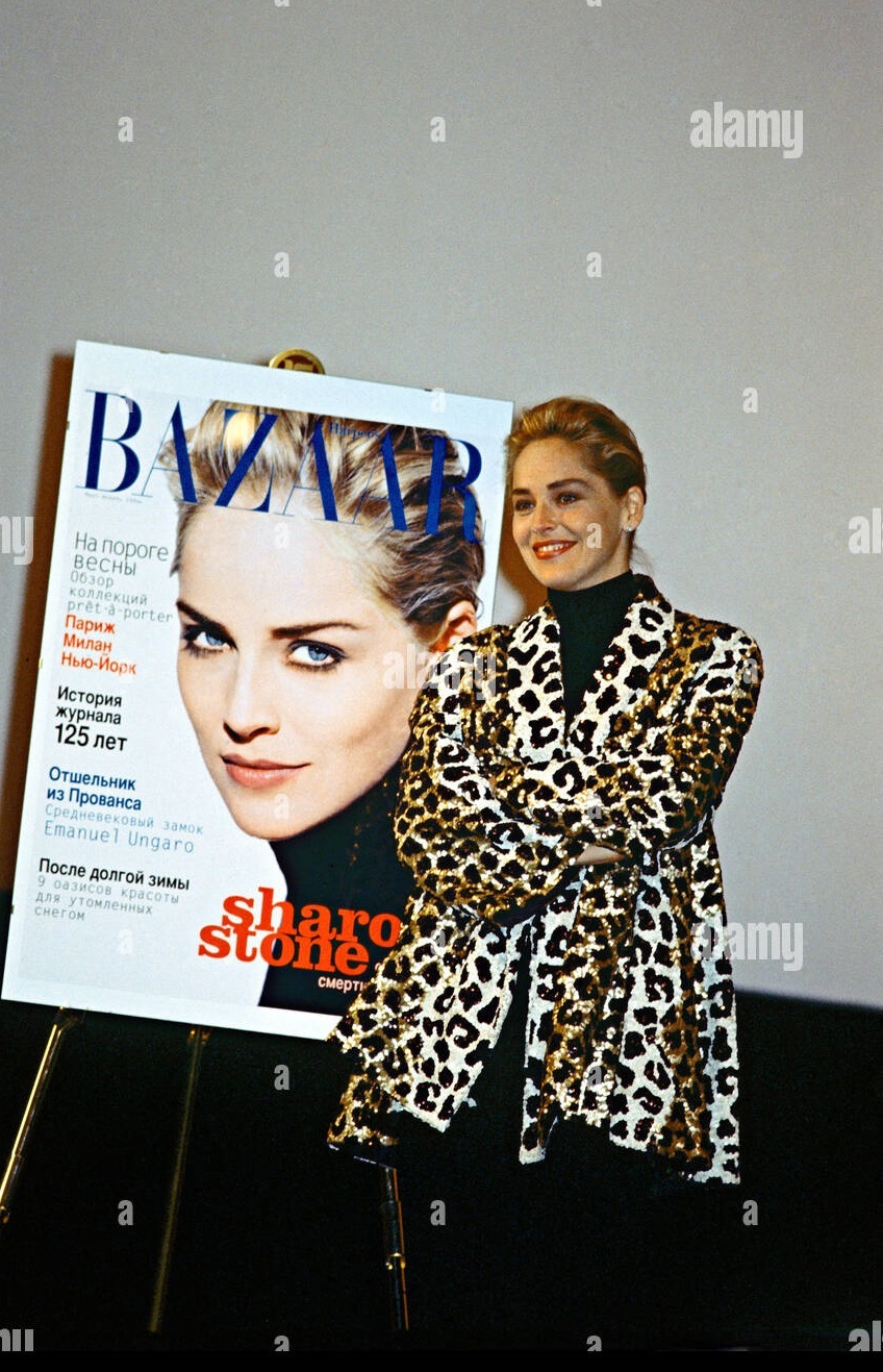 Актриса Шэрон Стоун во время пресс-конференции в Москве, посвященной выходу в свет первого номера западного издания Harper’s Bazaar ("Харперс Базар") на русском языке, 1996 год.