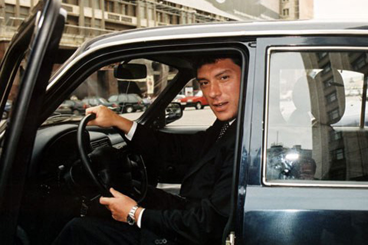 Борис Немцов позирует в служебном автомобиле «Волга», 1990-е годы.