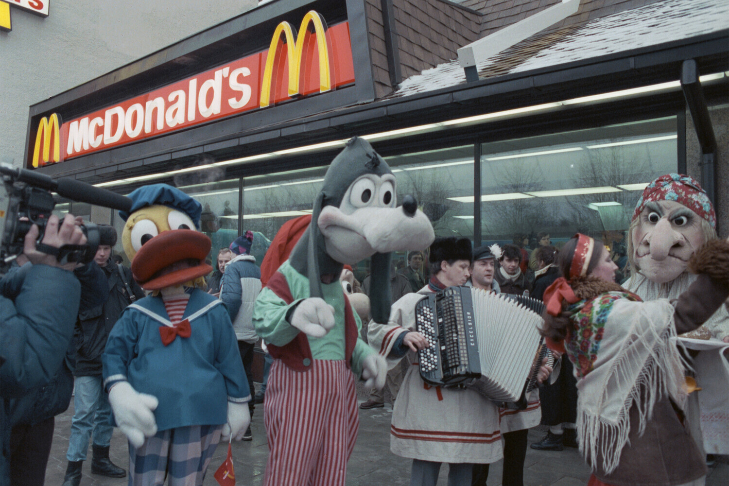 Ростовые куклы, участники самодеятельности и посетители у входа в день открытия первого ресторана быстрого обслуживания «Макдоналдс» на Пушкинской площади в Москве, 31 января 1990 года.