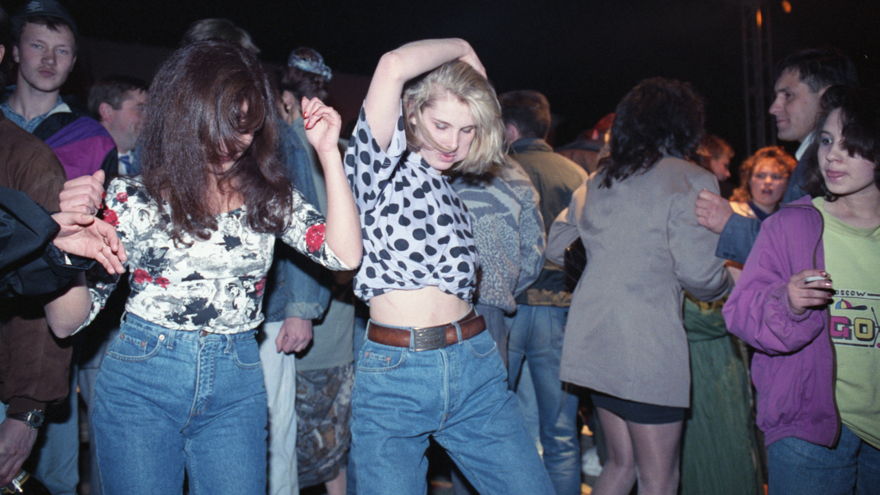 Девушки танцуют на дискотеке в саду «Эрмитаж», где проходит «Весенний бал полнолуния», посвященный 100-летию со дня рождения писателя Михаила Булгакова, Москва, 1992 год.