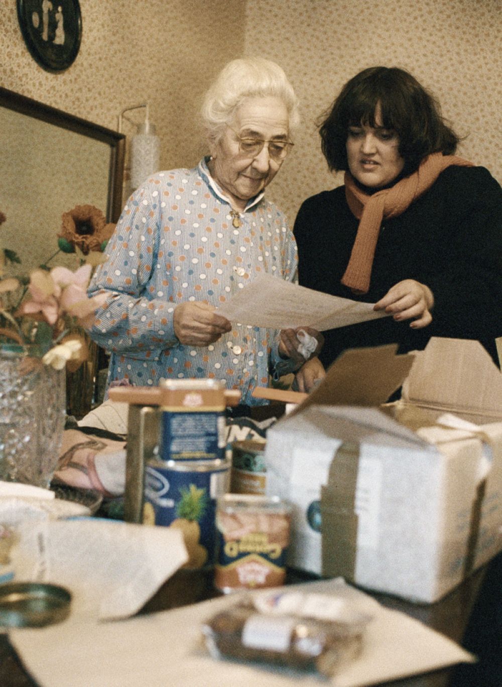Инспектор Московского райсовета Рита Дзасохова вручает инвалиду I группы Анне Гальпериной посылку с гуманитарной помощью, присланную из Гамбурга, 1992 год.