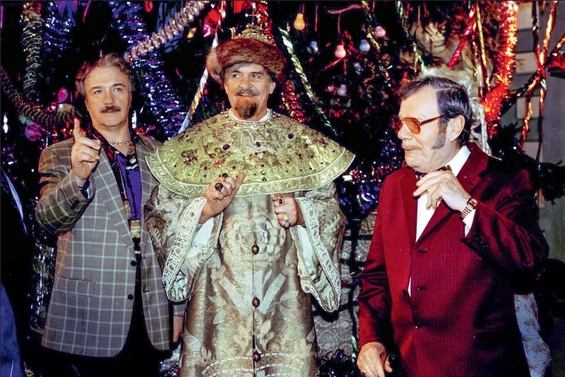 Рулевой «МузОбоза» Иван Демидов и продюсер Юрий Айзеншпис весело встречают Новый год, 1990-е годы.