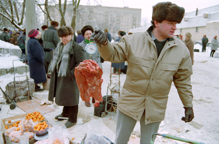 Фермер из Украины продает мясо на одной из московских улиц. 19 января 1994 год.