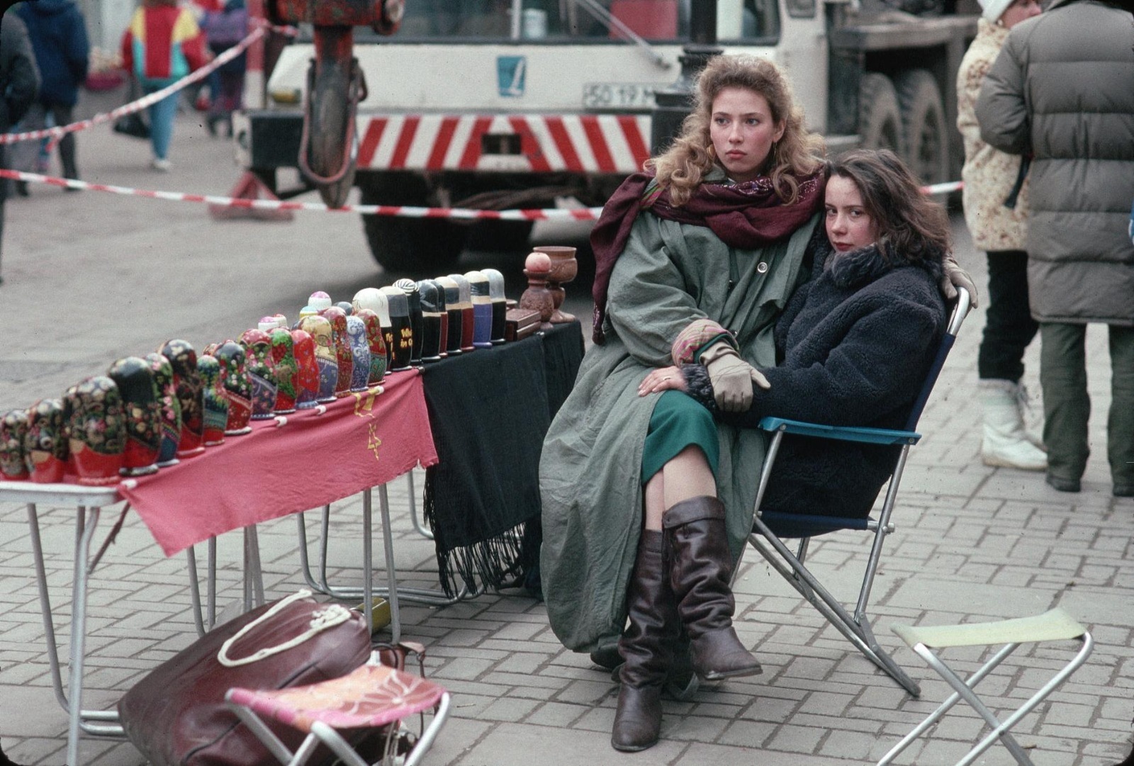 Девушки торгуют матрёшками На Арбате. Москва, 1990 год.