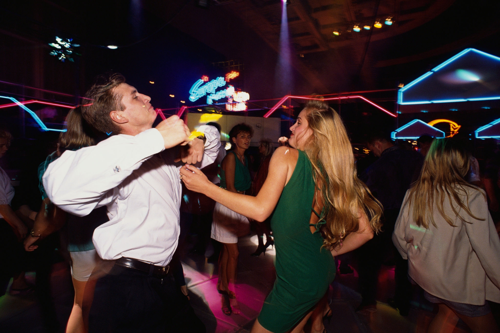 Молодые люди танцуют на дискотеке «У ЛИС'Са». Москва, 1992 год.