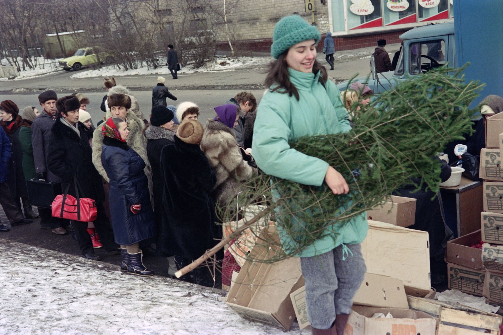 Москвичи выстраиваются в очередь перед ящиками с фруктами и овощами, а молодая девушка несет новогоднюю елку. 24 декабря 1990 год.