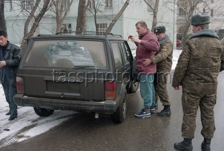 Специализированный отряд ГАИ по борьбе с преступностью во время проверки одной из машин на наличие оружия и наркотиков. Москва, 1993 год.