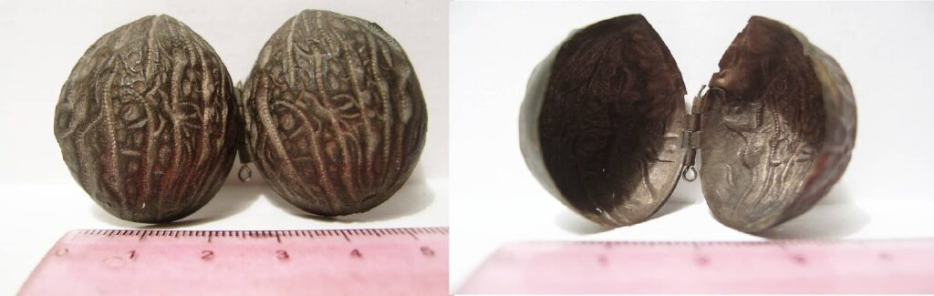 Еще одна необычная находка попалась под катушку кладоискателям в далеком 2004 году. Металлодетектор издал четкий и однозначный сигнал – копать! По всем параметрам там была, как минимум, крупная монета. Но при выкапывании в ямке оказался грецкий орех. С мыслью, «как это еще не сгнило?», орех откинули в сторону. И сигнал чудесным образом пропал. Совсем. Взывая к земляным богам, кладоискатель прозвонил всё вокруг. Сигнал шел… от ореха! При ближайшем рассмотрении таинственный грецкий орех оказался медной шкатулкой, весьма искусно и реалистично сделанной. Вероятно, мастер выбивал орнамент прожилок по настоящему ореху. Шкатулочка стала приятным экземпляром в коллекции необычных находок.