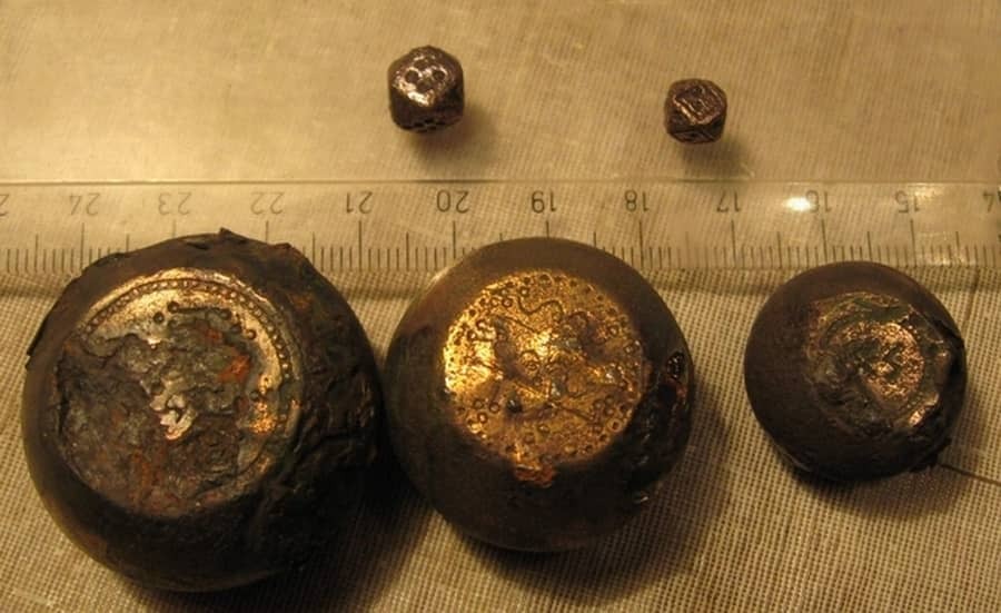 Еще одной редкой и необычной находкой, которая ставит в ступор археологов, стали весовые гирьки с непонятными надписями или орнаментом. По форме похожи на бочонки, вес варьируется от 5 до 90 гр, на плоских поверхностях нанесен непонятный орнамент. Надписи представляют собой нечто среднее между куфическим письмом и славянскими руническими символами. Точно их определить, тем более расшифровать пока не удалось ни археологам, ни поисковому сообществу. Самое интересное, находят их всегда по несколько штук рядом. Пока известно минимум о двух таких комплексах, назначение и происхождение которых узнать не удалось.