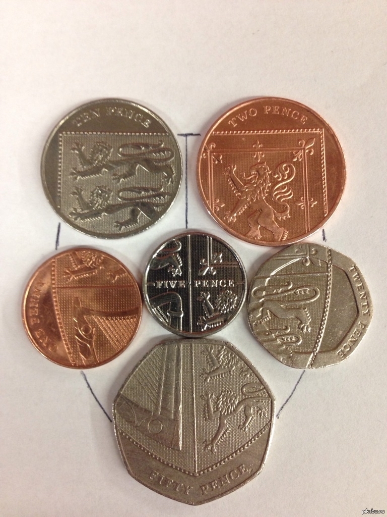 Ищи британские монеты. Причём желательно поторопиться. Т.к. дизайн меняют при смене монарха. А как мы знаем, как раз это сейчас и происходит.