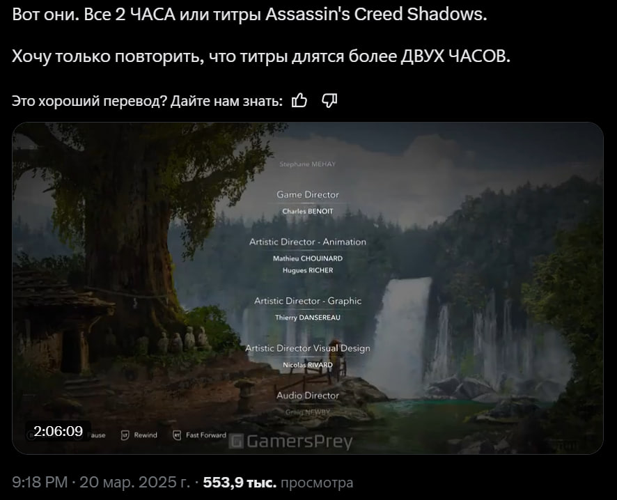 Интересный факт: титры к Assassin's Creed Shadows длятся... более двух часов