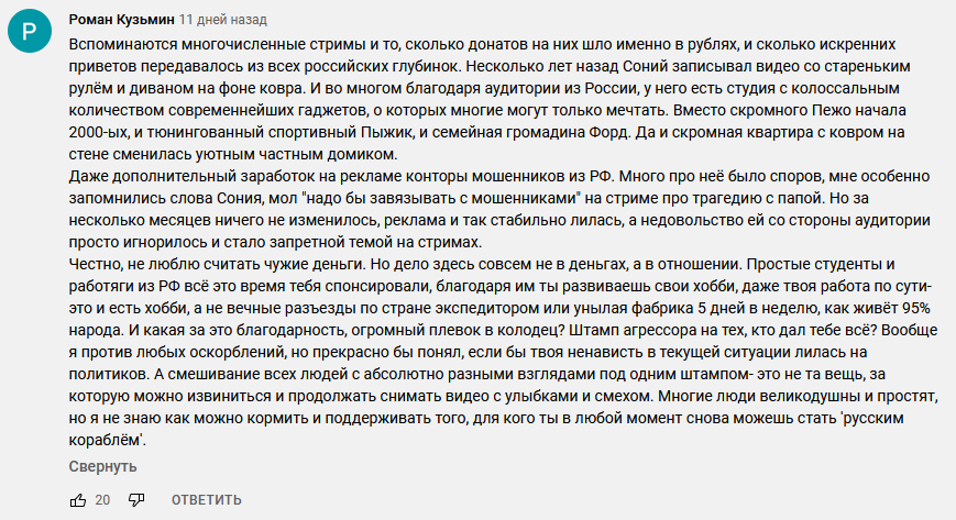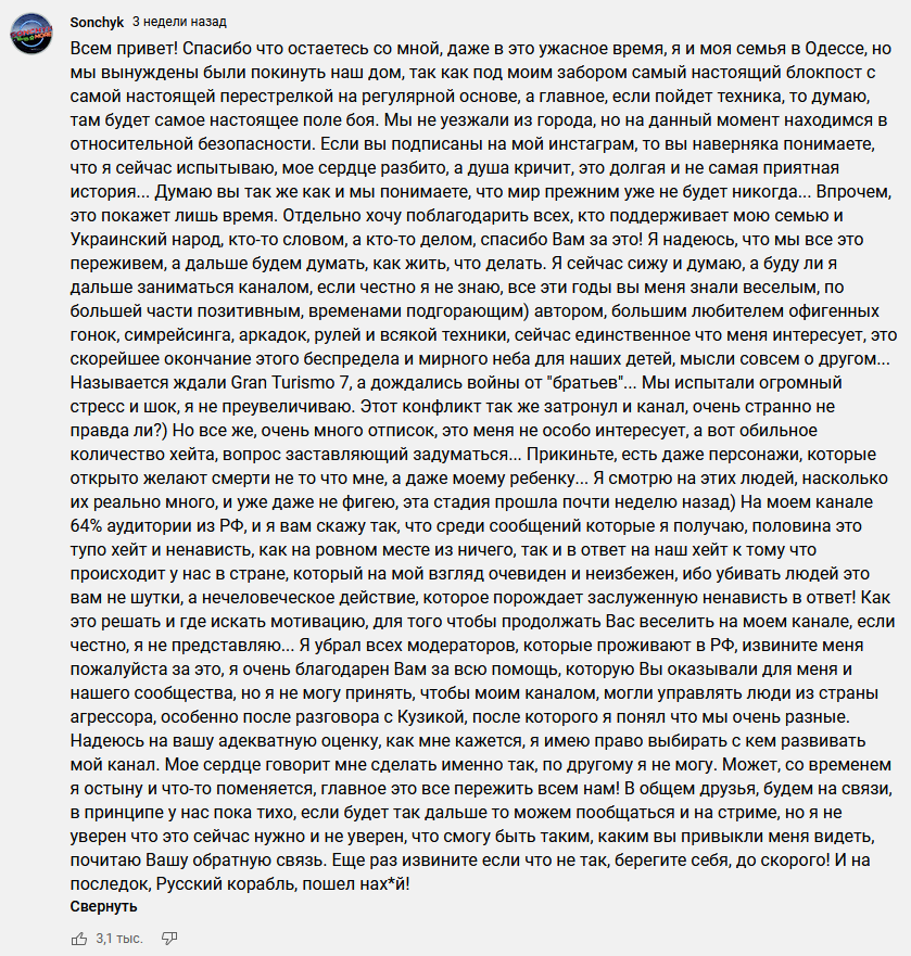 По факту: Данный Одесский блогер ведет стримы на тему симрейсинга, обзоров рулей и прочих приблуд. Исключительно на русском языке. Собственно, благодаря донатам из РФ, он смог достичь тех высот, что в одночасье решил обменять их на хайп. У него получилось. Перебанив друзей, модераторов и спонсоров из РФ под предлогом врагов в нынешнем положении вещей, он потерял львиную долю той поддержки, что была. Просмотры упали, донаты теперь идут исключительно в гривнах, которых теперь видимо не хватает на прошлую жизнь, судя по переобувке с удалением поста. Теперь важно запомнить таких двуличных блогеров и не забывать.
