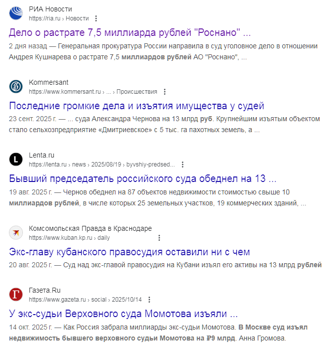 19 августа 2025 года Красногорский городской суд Московской области по иску Генпрокуратуры изъял в пользу государства имущество бывшего председателя Краснодарского краевого суда Александра Чернова на 13 млрд руб. Крупнейшим изъятым объектом стало сельхозпредприятие «Дмитриевское» с 5 тыс. га пахотных земель, а также 87 объектов недвижимости, включая земельные участки, коммерческие здания и квартиры совокупной стоимостью свыше 10 млрд руб.