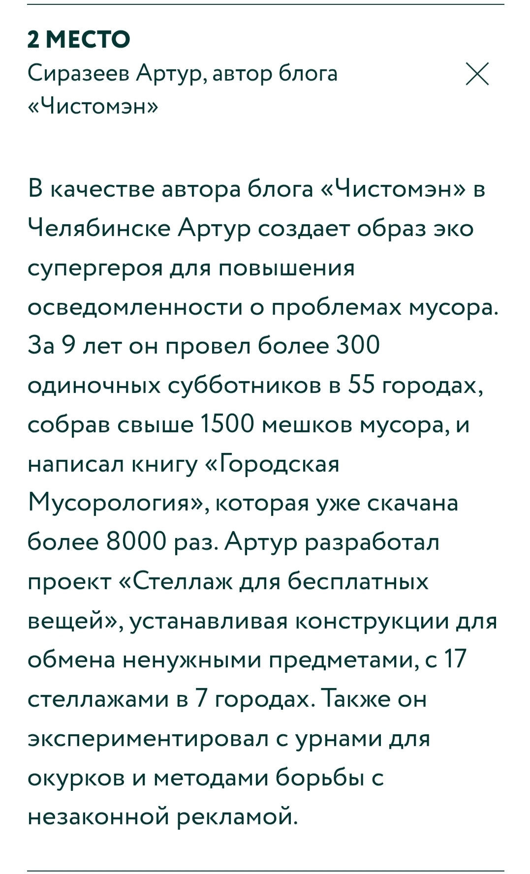 Вопрос 8. Расскажи про Зелёную премию-2024, точнее про твою деятельность после ее получения. Ты участвуешь или намереваешься участвовать в просветительской кампании, проводимой ППК Российский экологический оператор?