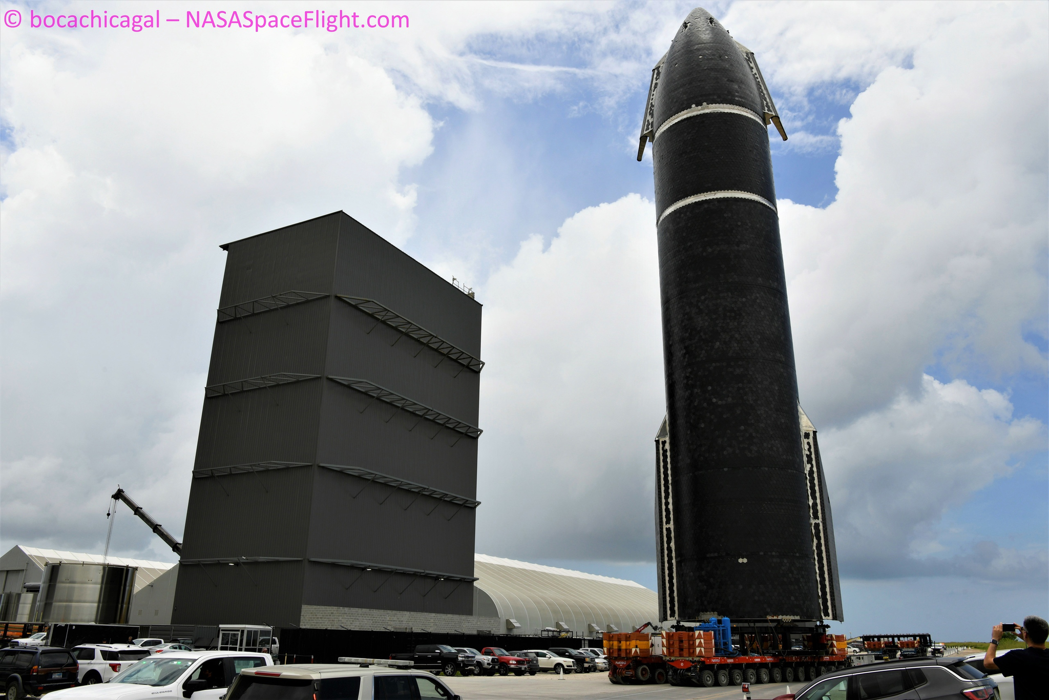 Для установки ускорителя и корабля для первого пуска будет использован кран. Хотя это более сложный способ установки, он позволяет SpaceX начать полёты ещё до того, как башня обслуживания будет окончательно собрана.