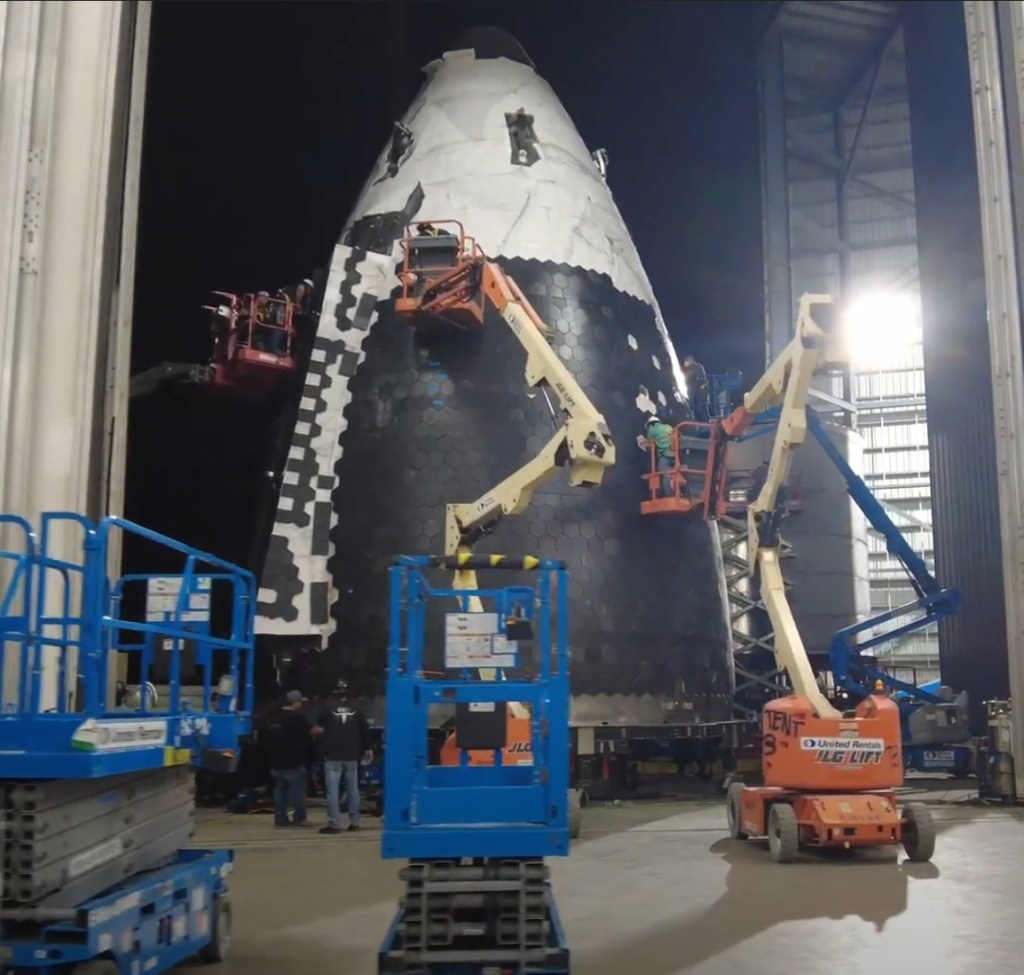 Маск отметил, что новая конструкция носовой части обтекателя состоит из двух видов листов формованной нержавеющей стали, тогда как старая носовая часть была сделана из трёх видов штампованных секций. В новом обтекателе применяется метод проката стали на новом большом станке, в результате чего получаются гораздо более гладкие и ровные пластины. Маск также отметил, что SpaceX на данный момент прекратила все работы над створкой обтекателя (ред. - грузового Starship), поскольку она не нужна для орбитального демонстрационный полёта. Кроме того команда ещё не начинала работу над системой дозаправки Starship на орбите, поскольку в краткосрочной перспективе в этом нет необходимости.