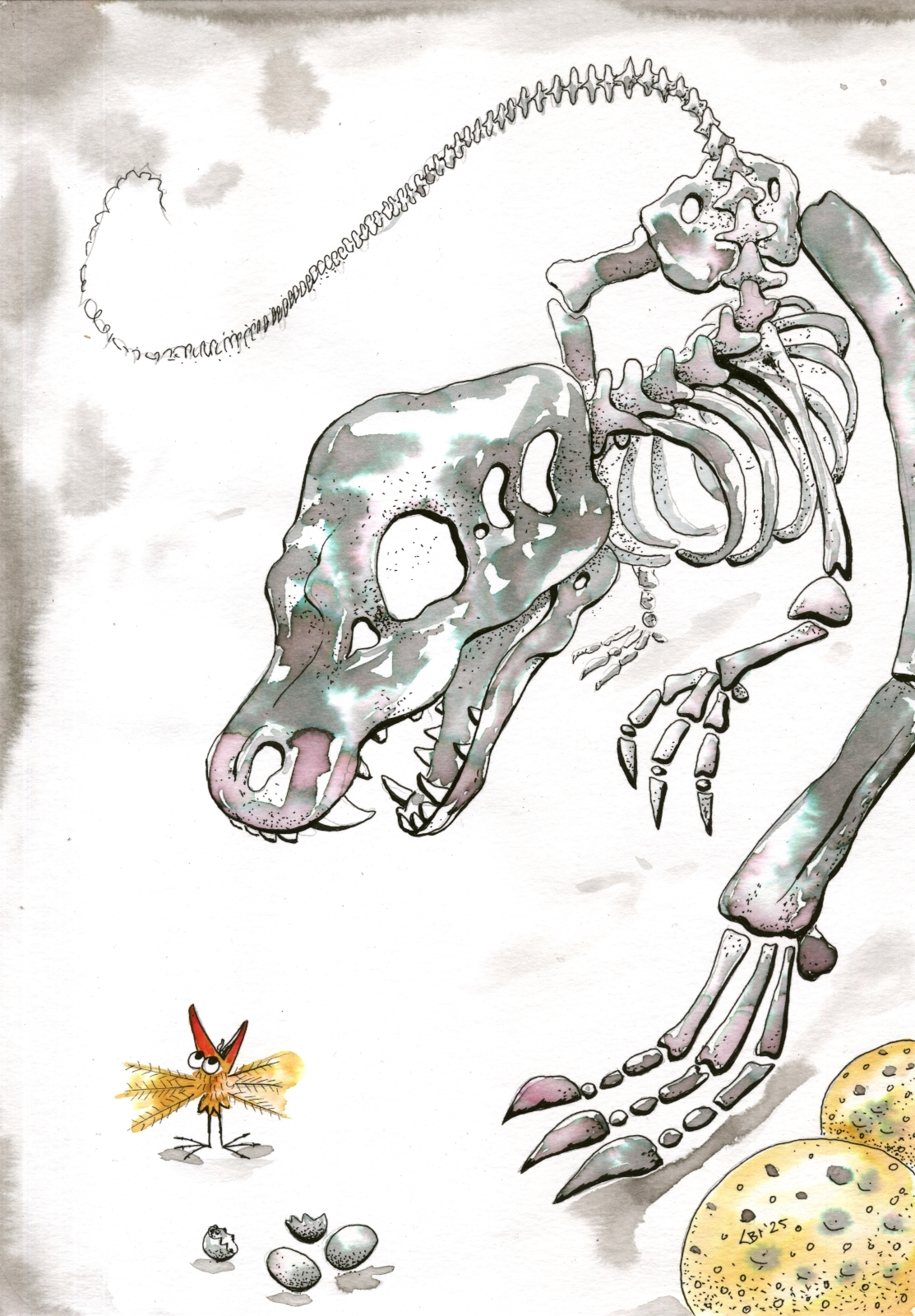 Возмущен милый птенчик потерей размера. Говорит ему предок: "Живым лучше быть и летать, чем сухими костьми в земле хорониться.