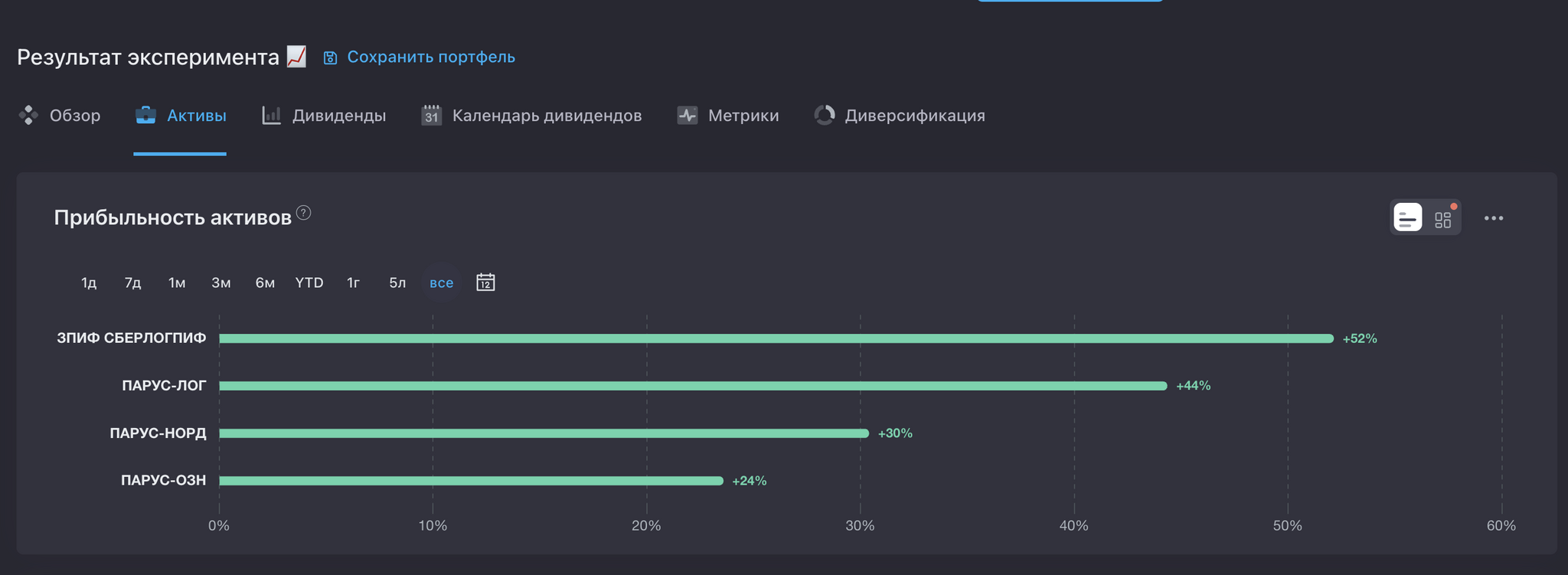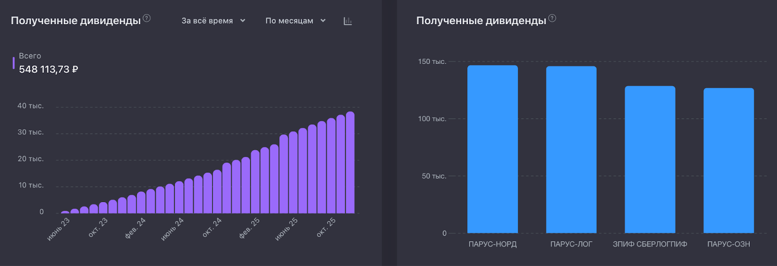 Складшот Парусян выбрал 4 фонда Паруса: ОЗН, ЛОГ, НОРД и СБЛ. Покупал их в равных долях ежемесячно на 100 000 рублей. Все выплаты реинвестировал.