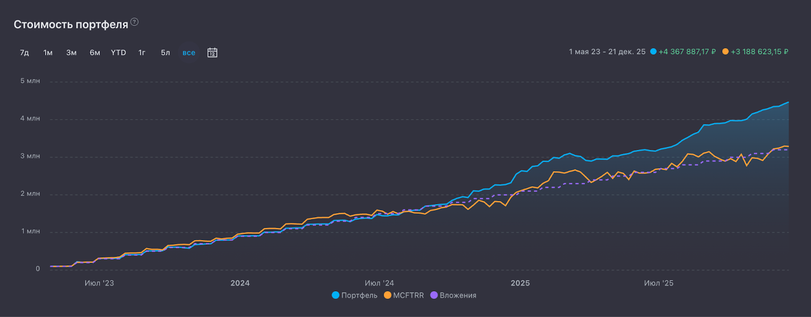 Пополнения составили фантастические 3,2 млн млн рублей — именно столько и получится у каждого, кто 32 месяца подряд будет пополнять портфель на 100 000 в месяц. Проверьте, у кого есть калькулятор.