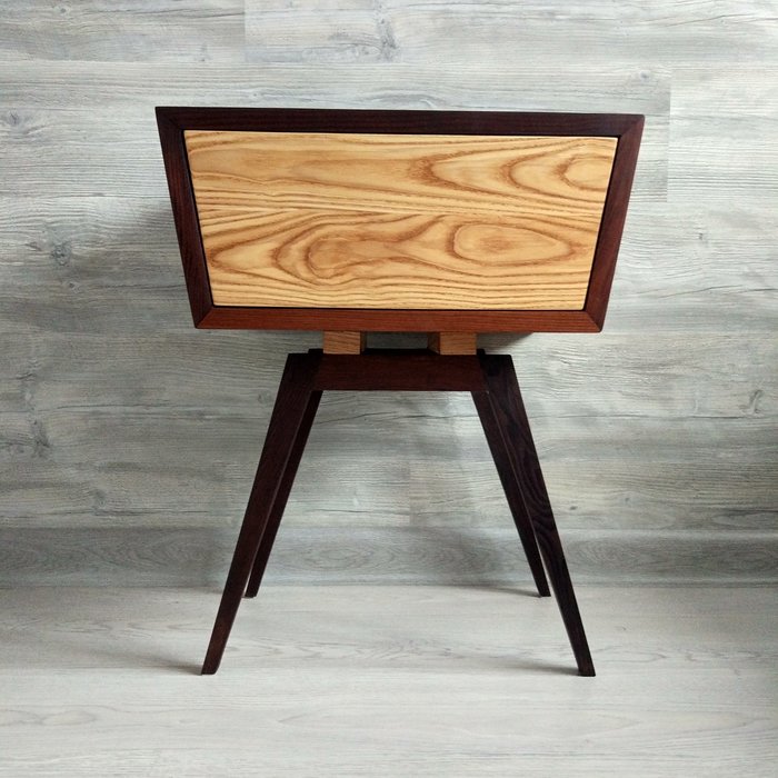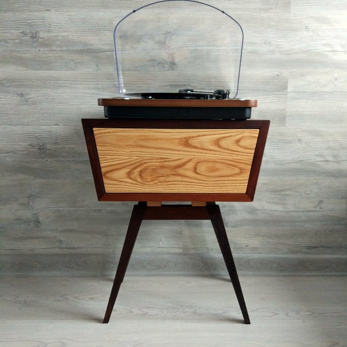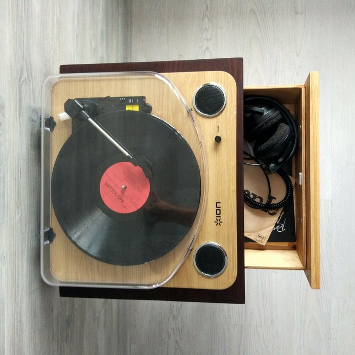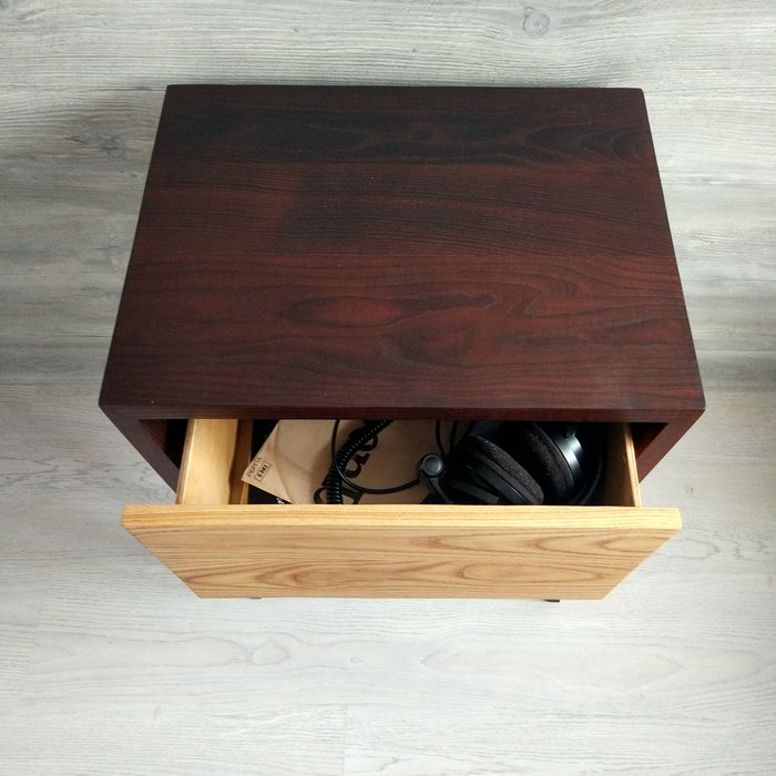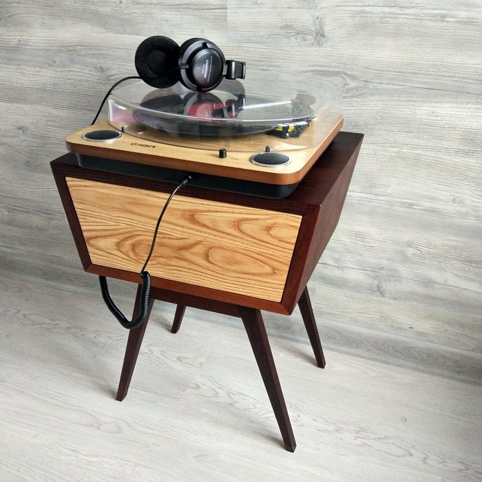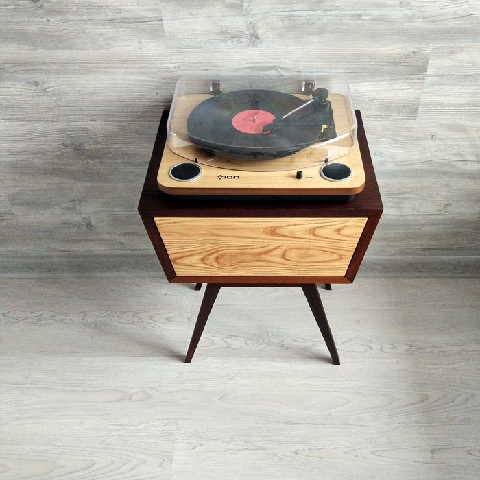 Проигрыватель у меня уже был, а вот большого вместительного ящика для пластинок и аудиомелочи не было. И ящик здесь повторяет форму самой тумбы, то есть расширяется снизу вверх. Это так необычно приятно выглядит, даёт визуально больший обьем, чем он есть на самом деле. Открывая его, как бы он не был забит, кажется, будто места там хоть отбавляй.