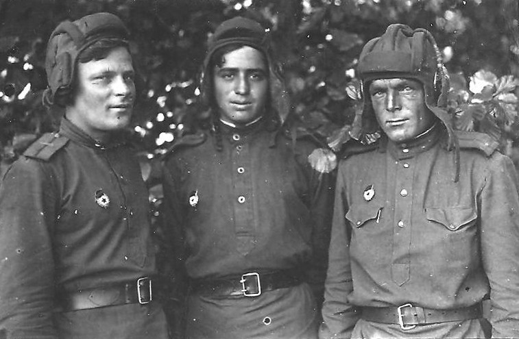 Гвардии младший лейтенант Ион Деген (в центре) со своими боевыми товарищами, 2-я гвардейская танковая бригада, 1944.Обращает на себя внимание оригинальное расположение звездочки на погоне офицера справа.