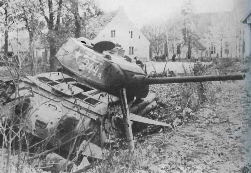 Т-34-85, согласно характерным тактическим обозначениям на башне, принадлежавший одной из гвардейских танковых бригад Красной Армии.