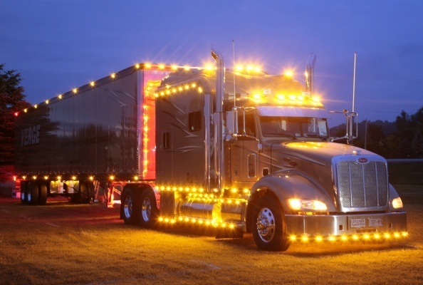 Внутри стоят траки (фуры) с элементами декора, которые продаются здесь. Вот к примеру KenworthW900. По лестнице к водительской стороне подъем и вид на навороченную кабину