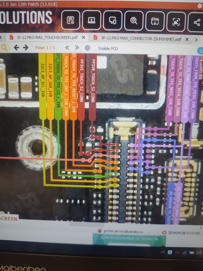 Прозванивал коннектор ещё раз и обнаруживаю КЗ на линии PP3V1_Touch_S2_conn которая идёт в главный КП через конденсаторы и резистор, уж было подумал приплыли.. ковырять главный КП не хотелось... И слава богу что не стал.