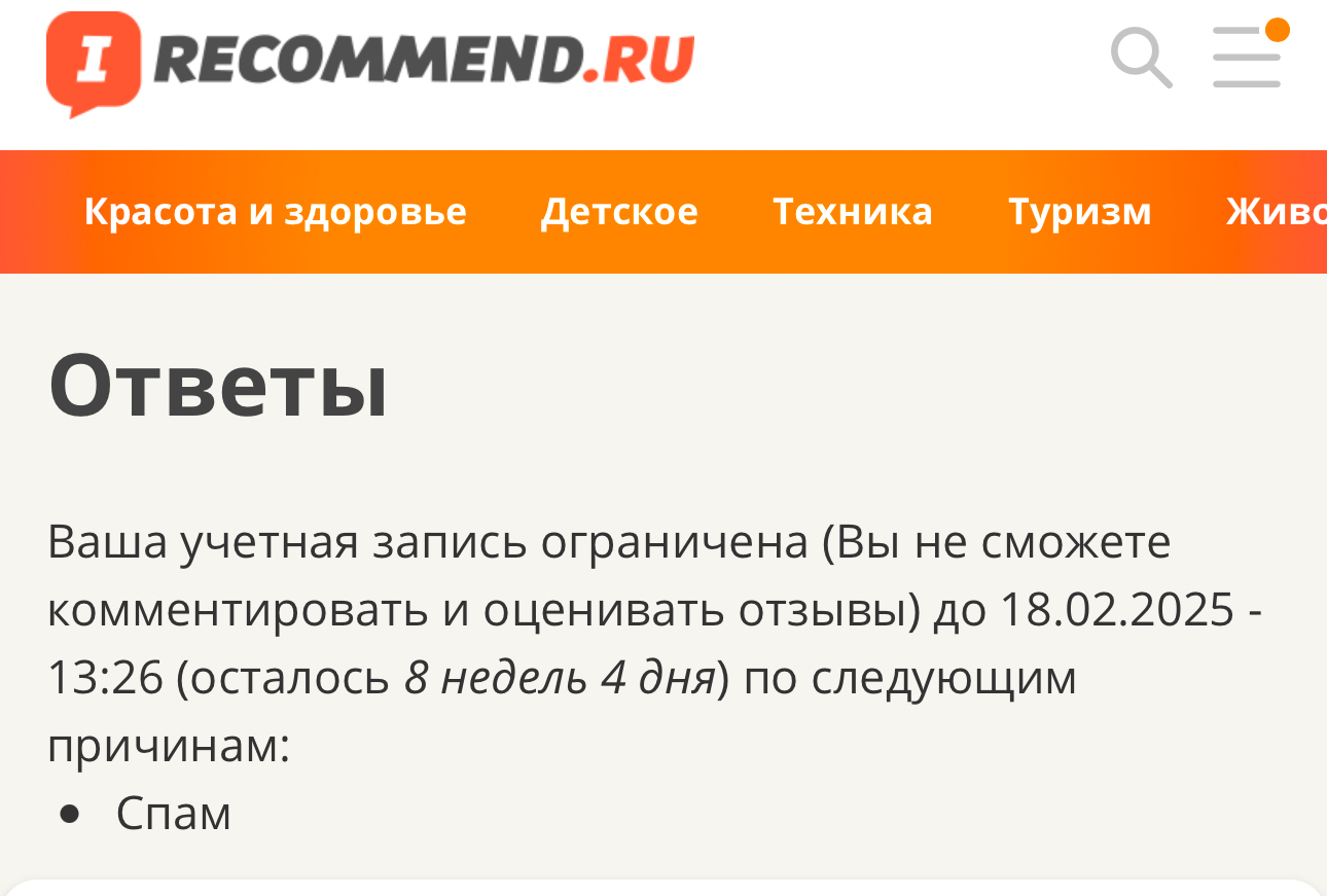 В один момент мне оставили негативный комментарий под моим отзывом, и я ответила на хамство в той же манере. В результате заблокировали только меня, а комментарий хамки оставили. Кроме того, меня заблокировали за то, что я указала модераторам на большое количество заказных отзывов в одном из разделов. Эта блокировка была установлена до февраля 2025 года, что выглядит как наказание за попытку выявить нарушения. Такой подход к пользователям сильно подрывает доверие к платформе.
