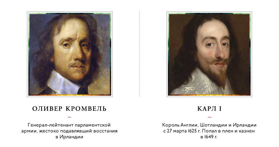 За время правления Кромвеля число ирландцев сократилось почти в три раза — с полутора миллионов человек до 600 тысяч. Зато прибавилось 150 тысяч поселенцев-протестантов, приехавших из Англии за дармовой землей.