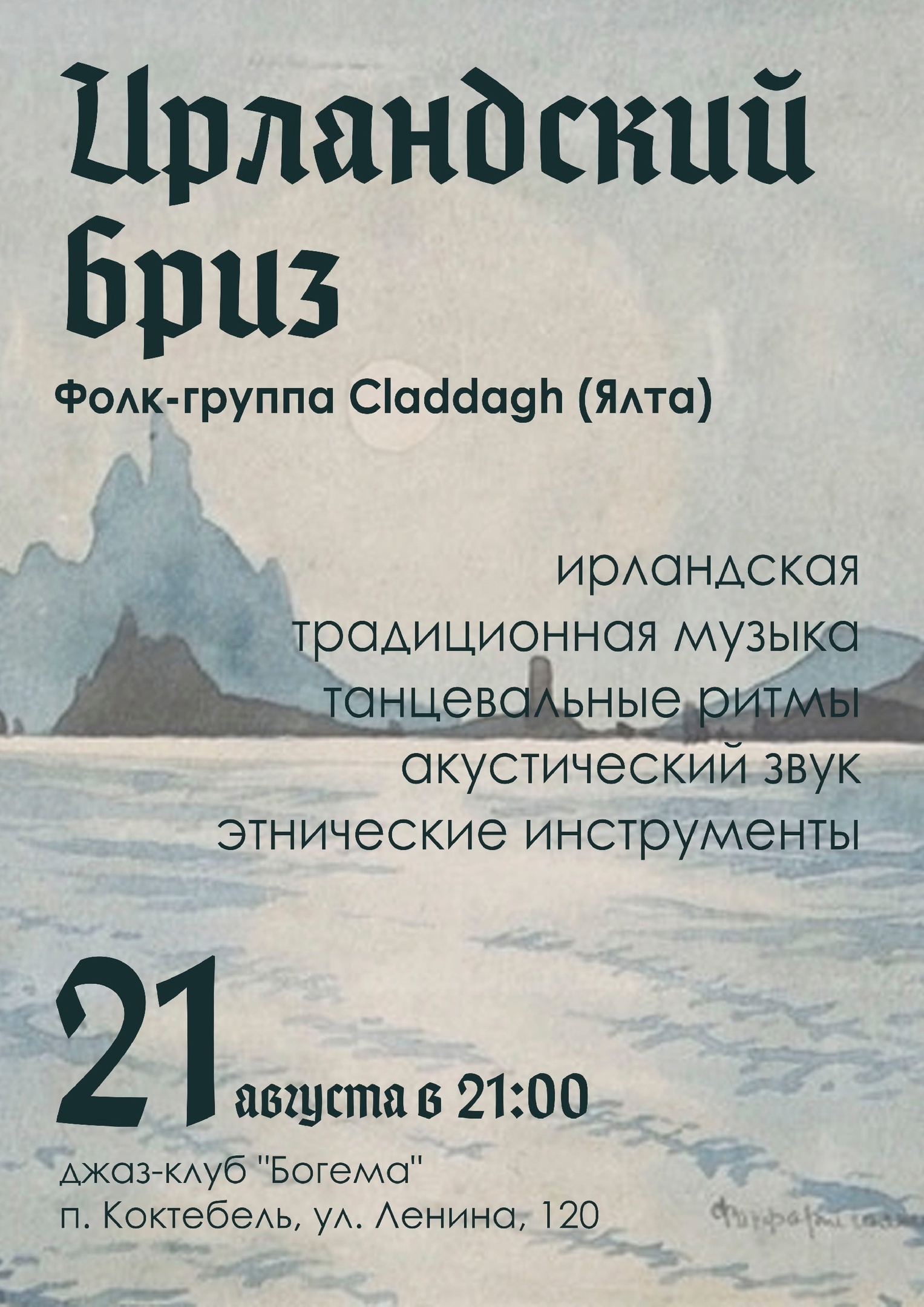 23 selfierevolver Республика Крым Ирландская музыка в Коктебеле 2 года назад Друзья, в понедельник, 21го августа приглашаем всех, кто отдыхает в Коктебеле, в легендарное джаз-кафе "Богема", где мы будем радовать Вас народной ирландской музыкой. До встречи. [моё] Фолк Ирландия Этническая музыка Коктебель Ещё 0