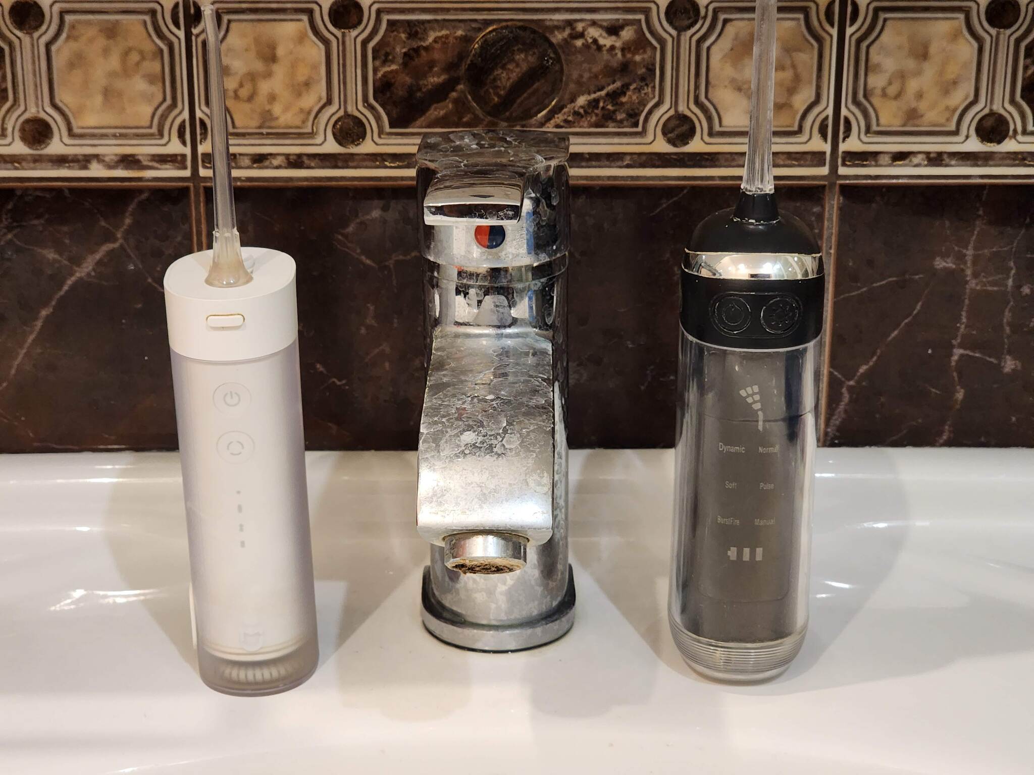 Левый Xiaomi Mijia — предыдущий. За год сломался. Нравился. Справа безымянные, ценой в пределах 1000 рублей был. Всем устраивает. Жаль только, что он тяжелее на 80 грамм. Клёвая опция: место для хранить насадки внутри самого ирригатора. Ещё мы всегда выбираем с USB, чтобы не было лишних шнурков, но перед зарядкой приходится просушивать разъём. Заглушки не спасают.