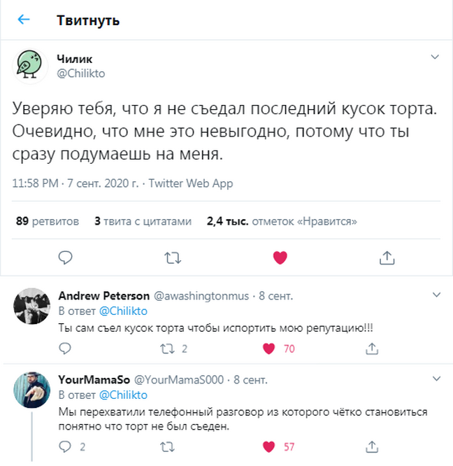 OxyeHHbluHuk 5 лет назад Is fecit cui prodest Ситуация является вымыслом, все совпадения с реальностью случайны, все аналогии с ней являются плодом вашего воображения. X (Twitter) Чилик Юмор Ещё 0