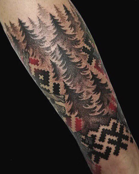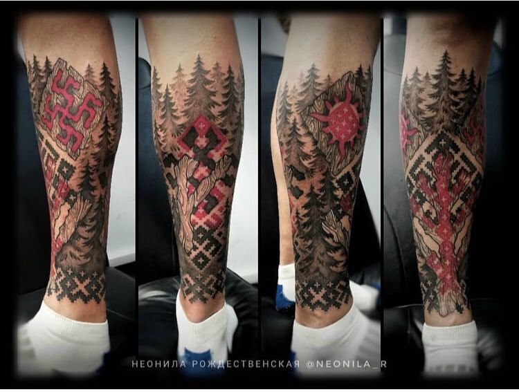 Если интересно поищите в инсте или ВК - Неонила Рождественская. Она рисует и бьет в славянской стилистике, и лесная тема в работах проскальзывает часто. Если пролистать до конца, то найдете одну работу, там чистый лес в обкрутку по ноге