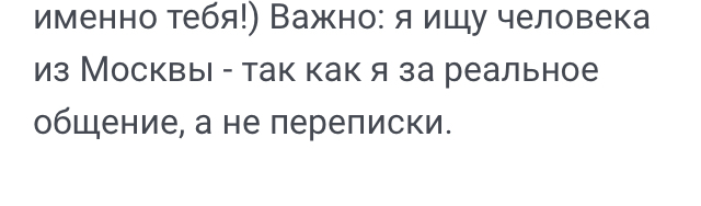 Дополнительные пожелания: здорово, если ты будешь выше меня (175-185), стройного или среднего телосложения, умеешь водить машину и живёшь отдельно от родственников (так как нам будет необходимо место для встреч).