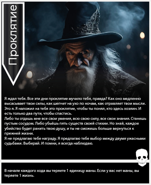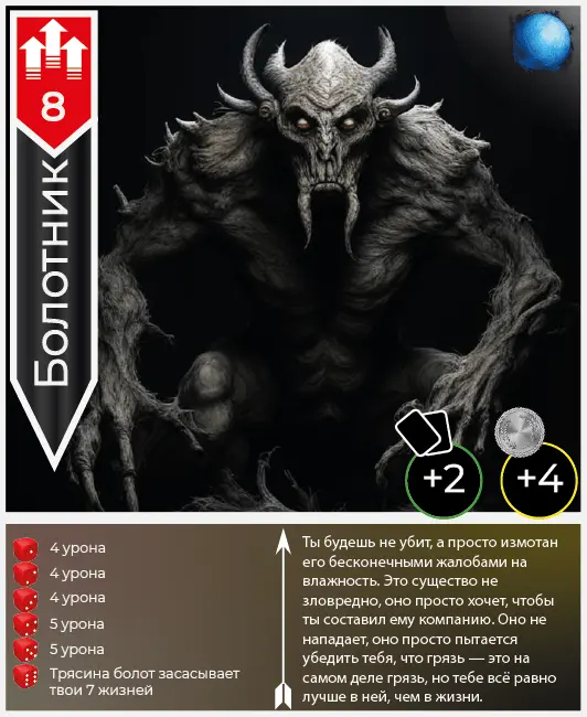 Кидаете кубик d6 и если выпадает четное, то вы ходите первый. Но, тут вам не повезло. И тогда вы снова кидаете кубик, чтобы увидеть, как сильно вас ударит монстр. Выпало 3. Всего 4 урона. Терпимо. Теперь ваш ответный ход. Но для этого кидать кубик уже не нужно, ведь у вас на руках есть карты умений и одной из них вы сразу же убиваете монстра.