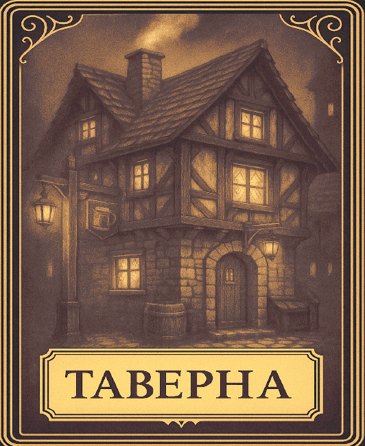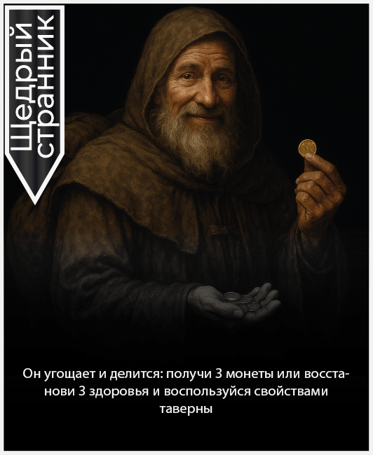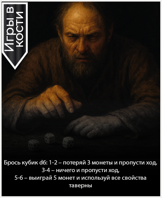Добравшись до таверны, вы, наверное, думаете, что сейчас просто в нее зайдете? Не тут-то было. В каждой таверне течет своя маленькая жизнь и чтобы понять, на какой из этапов жизни вы дошли до таверны, нужно вытянуть карту из соответствующей колоды.