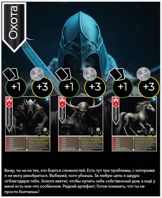 Разумеется, покупать и продавать нам нечего. Что денег, что карт умений у нас по минимуму. Тянет карту из колоды квестов и вытаскиваем карту охоты:
