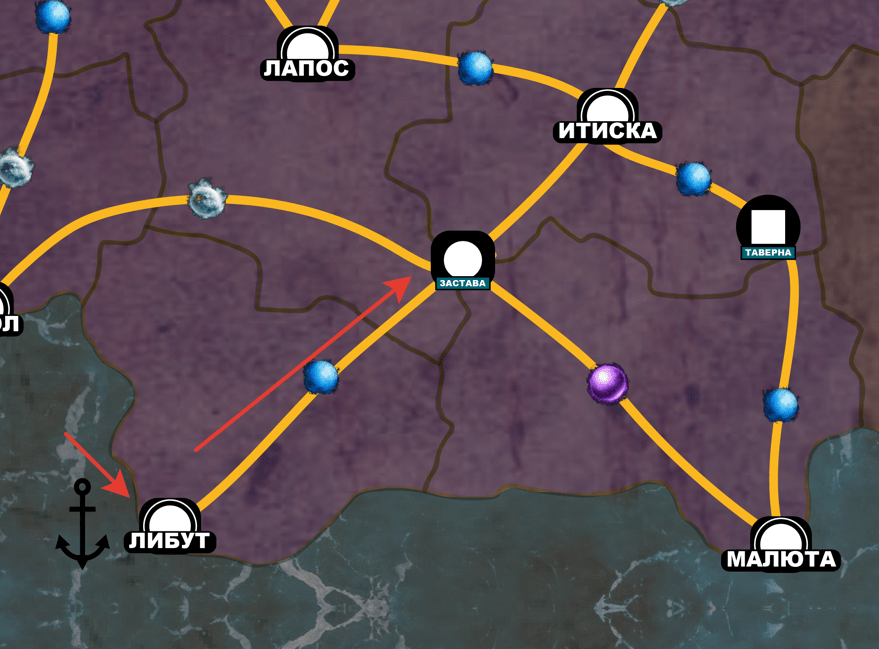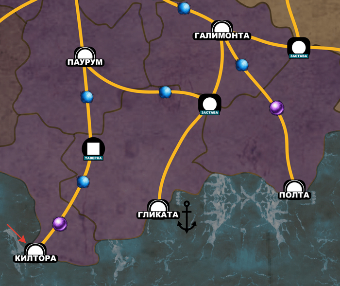 Итак, вы начинаете на карте в любом прибрежном городе, у которого нет пометки "Порт" (символ якоря). Например, в Килторе: