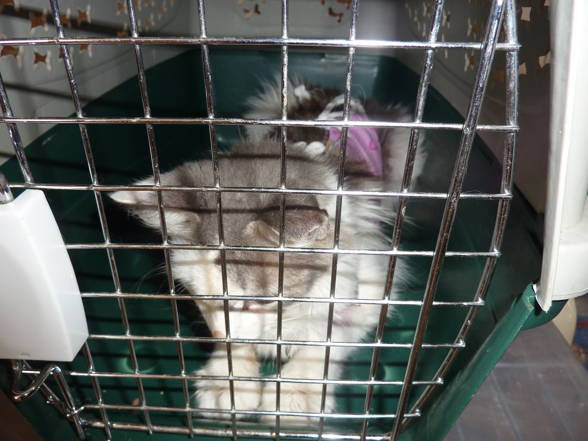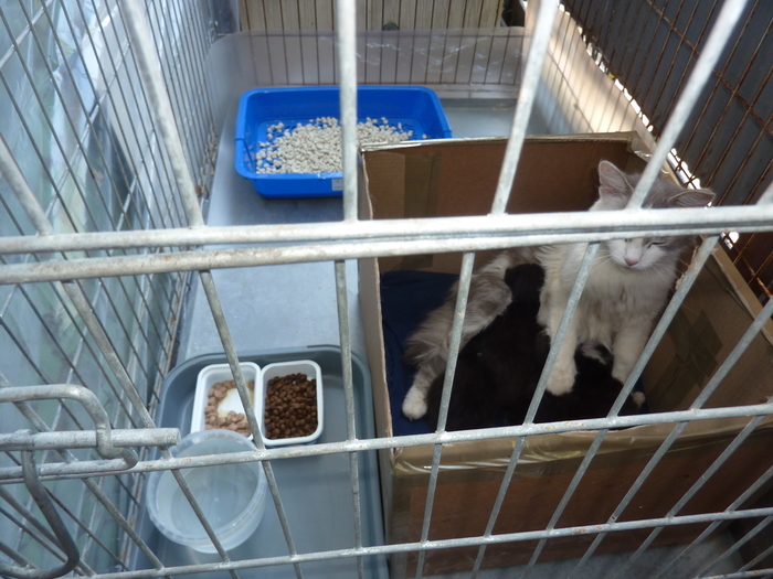 Первые две недели жила в коробке возле подвала. Далее взяла у волонтеров города клетку и поселила котосемью у себя на открытом балконе. Закрыла от ветра-дождя пленкой