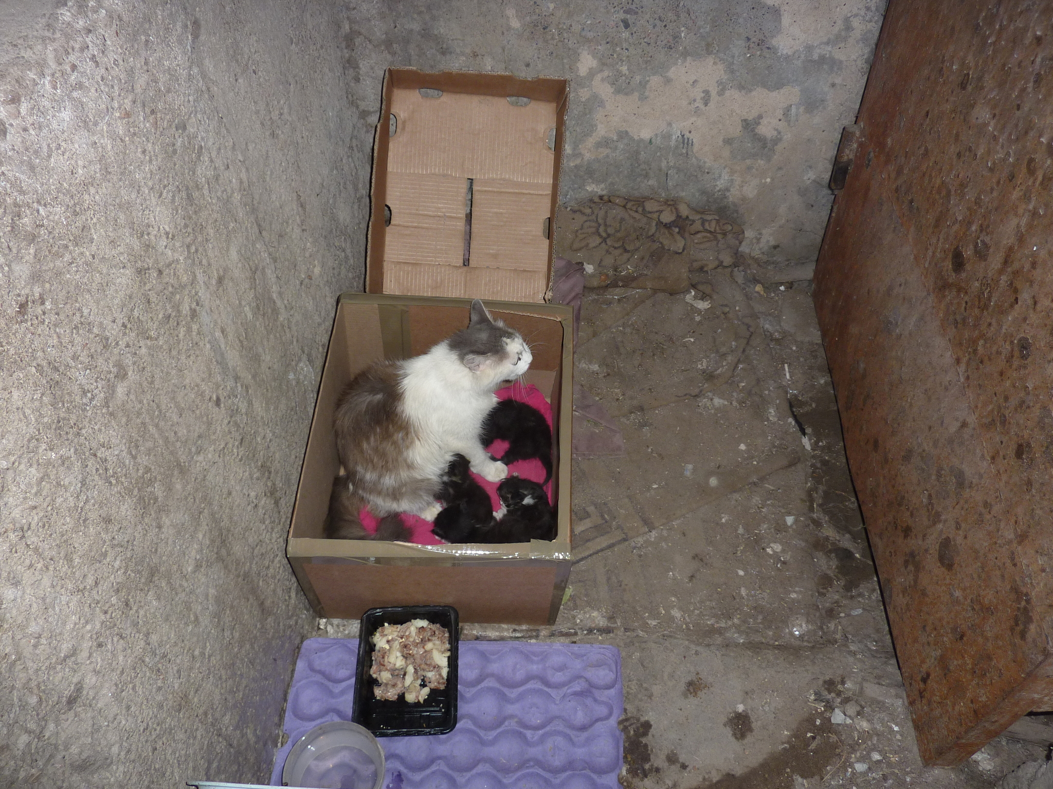 Дворовая бывшедомашняя кошка решила рожать прямо у подъезда 6 июня с.г. Вчера была стерилизована. Котят было 4, одна девочка и 3 пацана