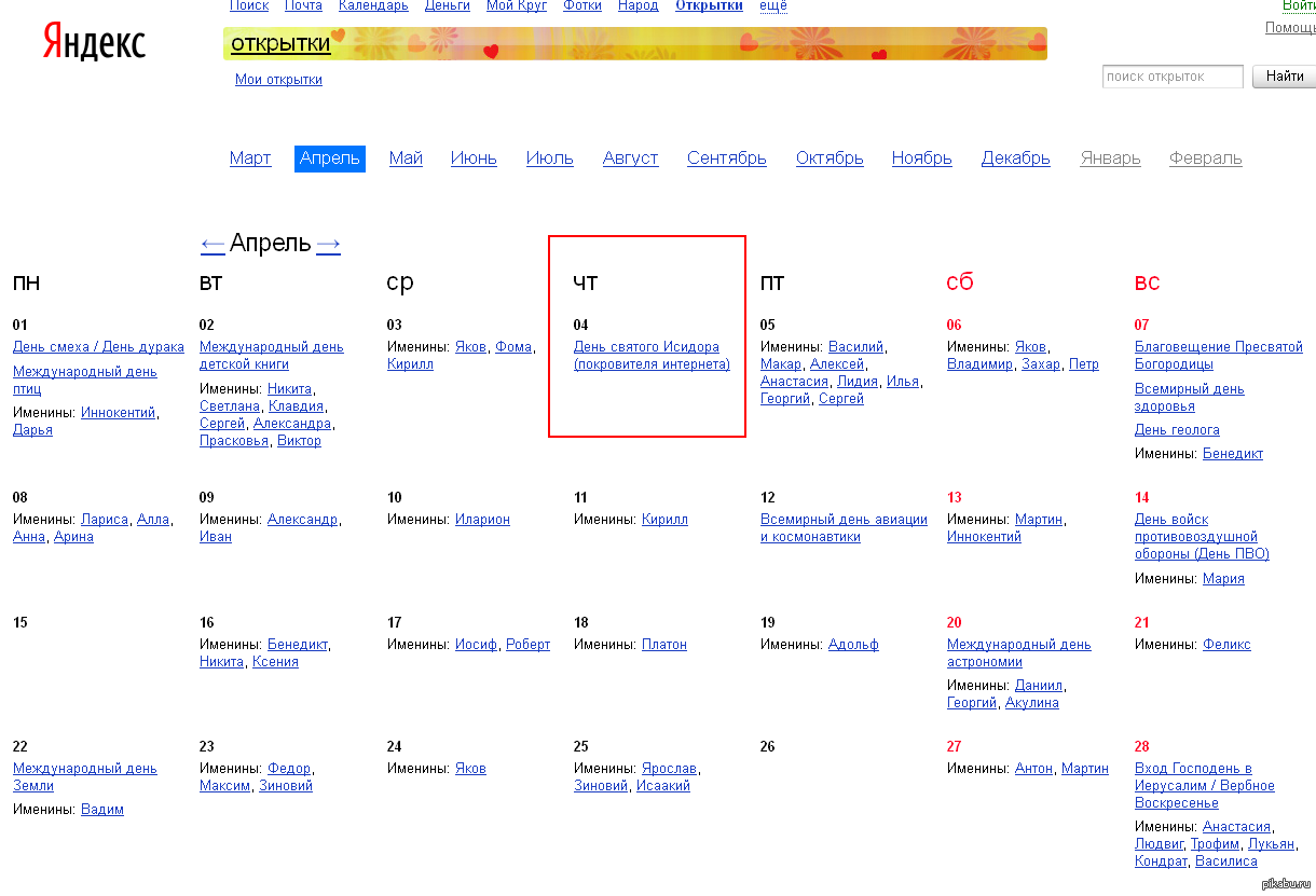 skyzevs Исидор 12 лет назад http://cards.yandex.ru/calendar.xml?date=2013-04 Исидор Яндекс Идиотизм Придумал Шнягу