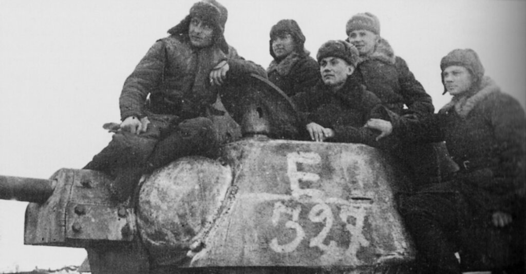 Танкисты 24-го советского танкового корпуса (с 26 декабря 1942 года — 2-го гвардейского) на броне танка Т-34 во время ликвидации окруженной под Сталинградом группировки немецких войск. Декабрь 1942 г. Но точно такие же Тридцатьчетверки освобождали и Белгород.